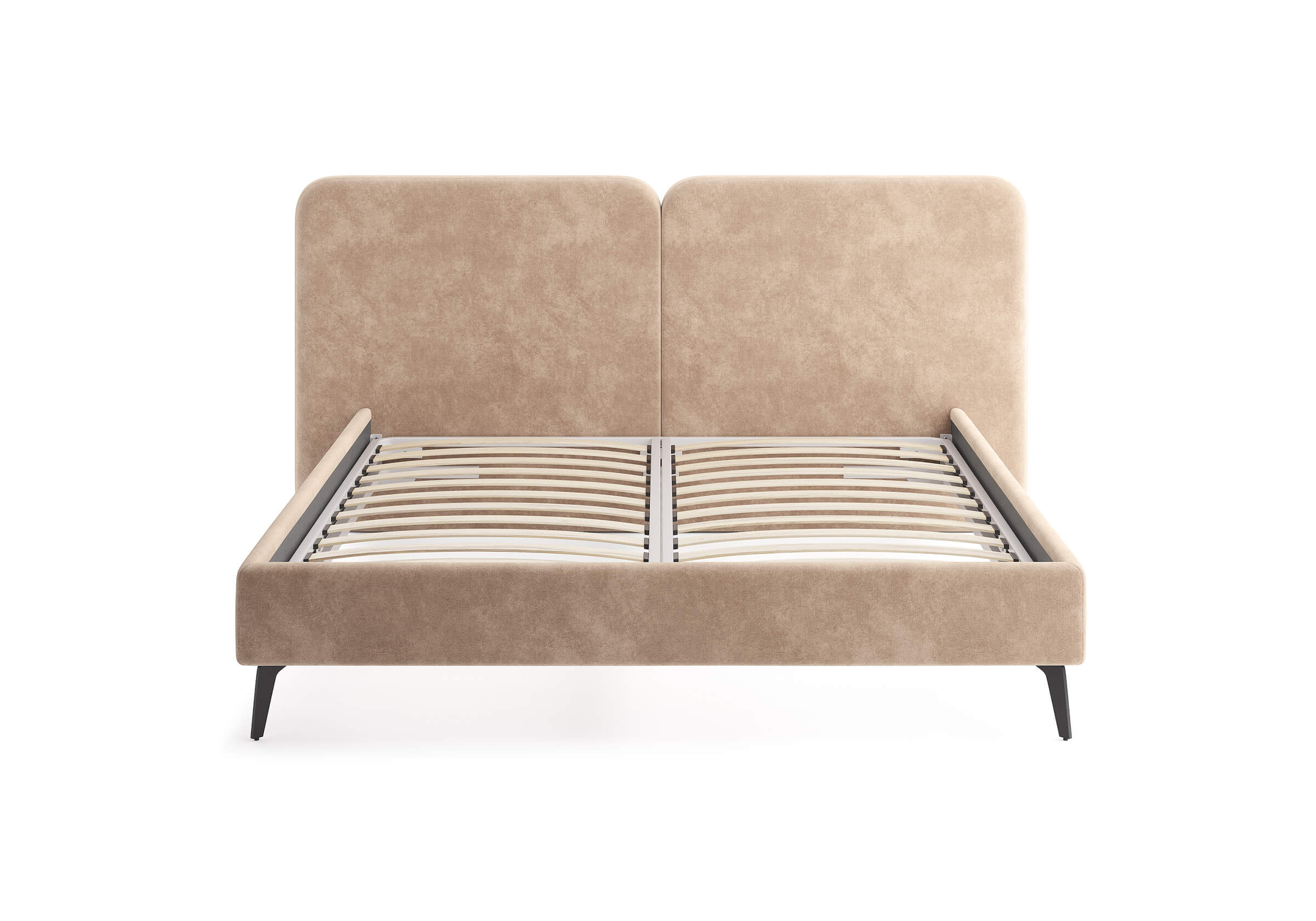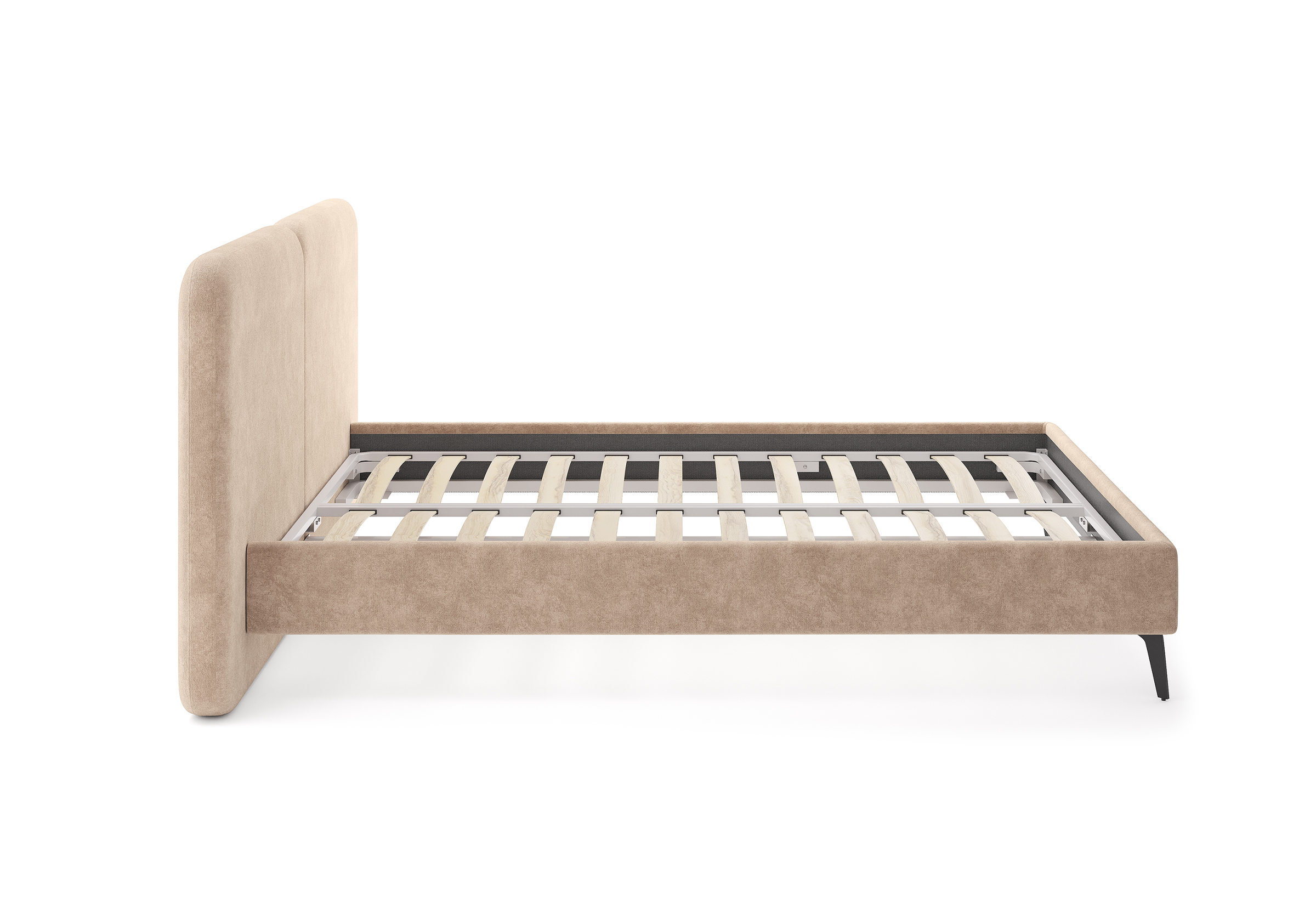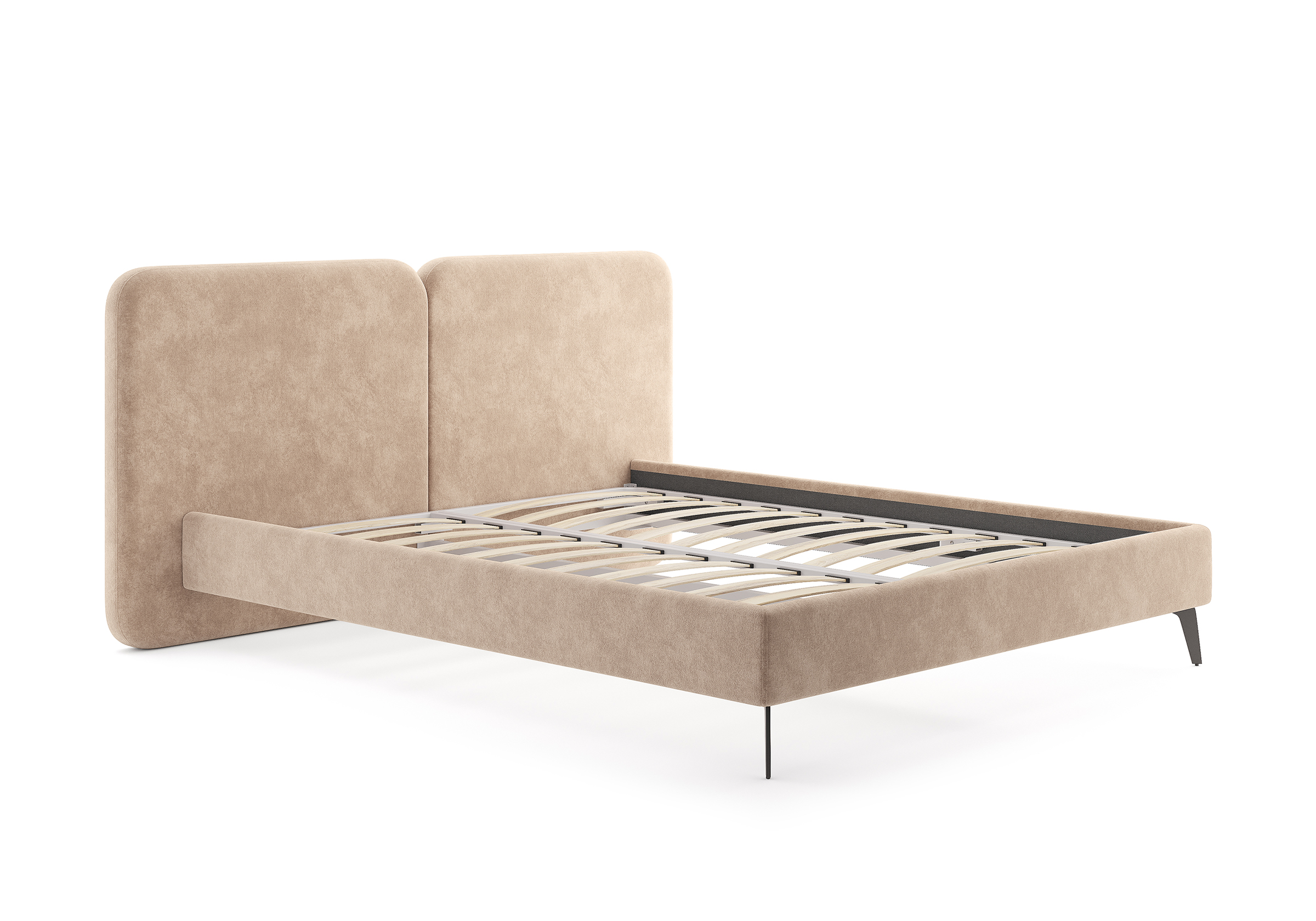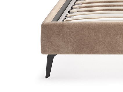 Основание кровати на металлических элегантных опорах. Благодаря увеличенной высоте позволяют осуществлять легкую уборку под кроватью, даже с помощью робота-пылесоса.