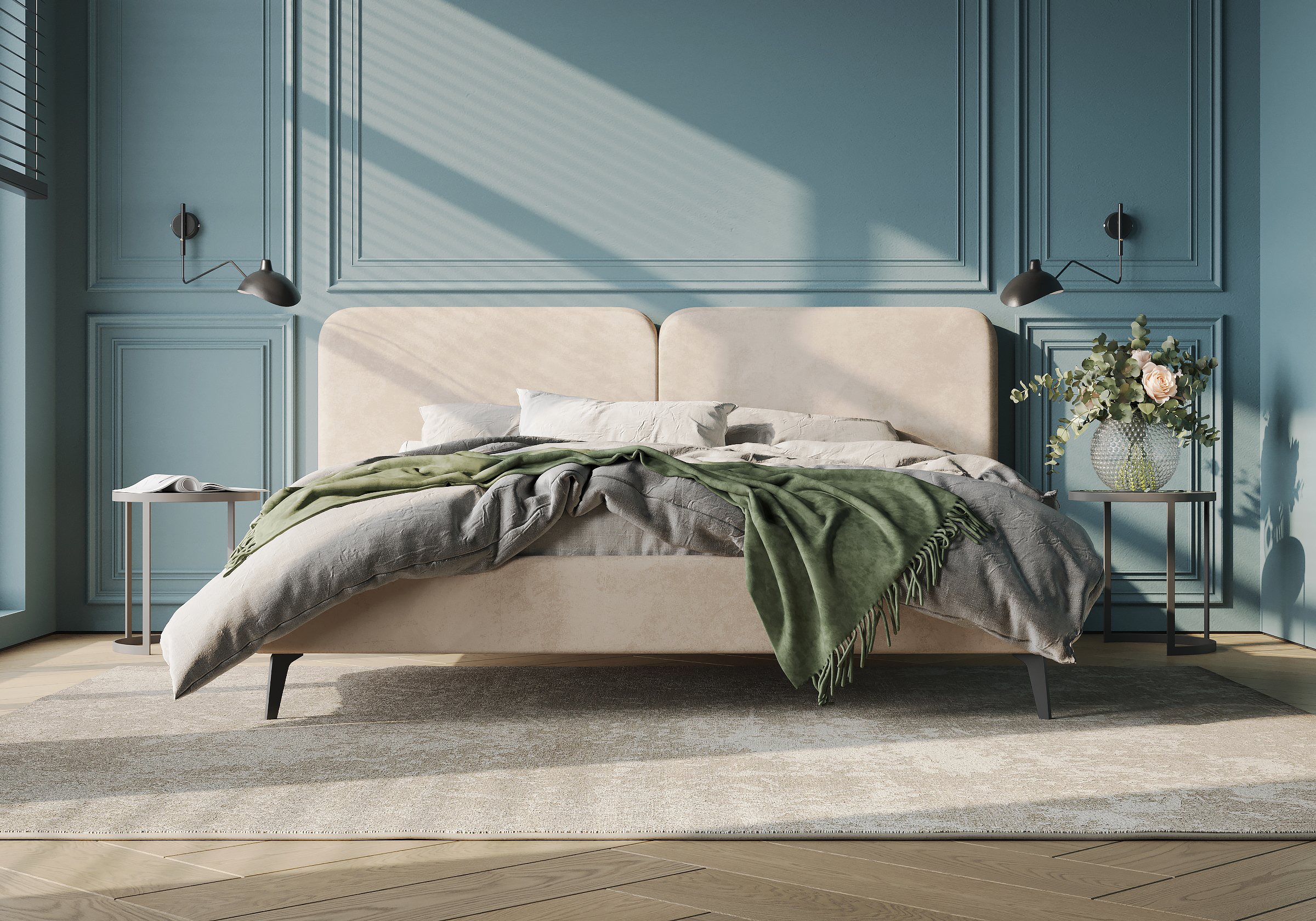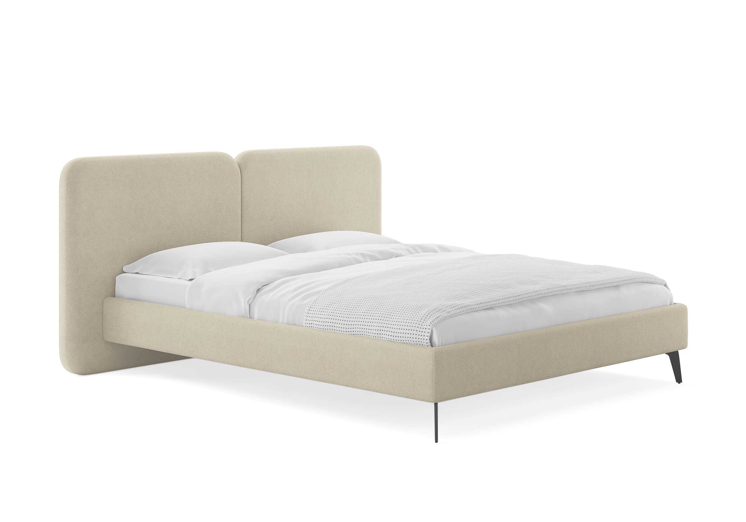 Дизайн кровати удачно подойдет для интерьеров в современном, стиле mid-century модерн. Закругленные углы, узкие царги, металлические опоры черного цвета выделяют Brooklyn из многообразия интерьерных моделей и делают ее востребованной для дизайнерских интерьеров. Изголовье выполнено в виде двух мягких подушек, они крепятся друг к другу с помощью прочного клинового соединения. Задняя часть спинки изготавливается в основной ткани - кровать можно установить в центре комнаты. Узкие царги и изящные металлические опоры, делают кровать легкой и лаконичной. Прочность кровати достигается за счет металлического каркаса по периметру. Модель укомплектована ортопедическим основанием. Расстояние до царг способствует легкой уборке под кроватью, в том числе роботом – пылесосом. Кровать изготавливается во всех видах ткани.