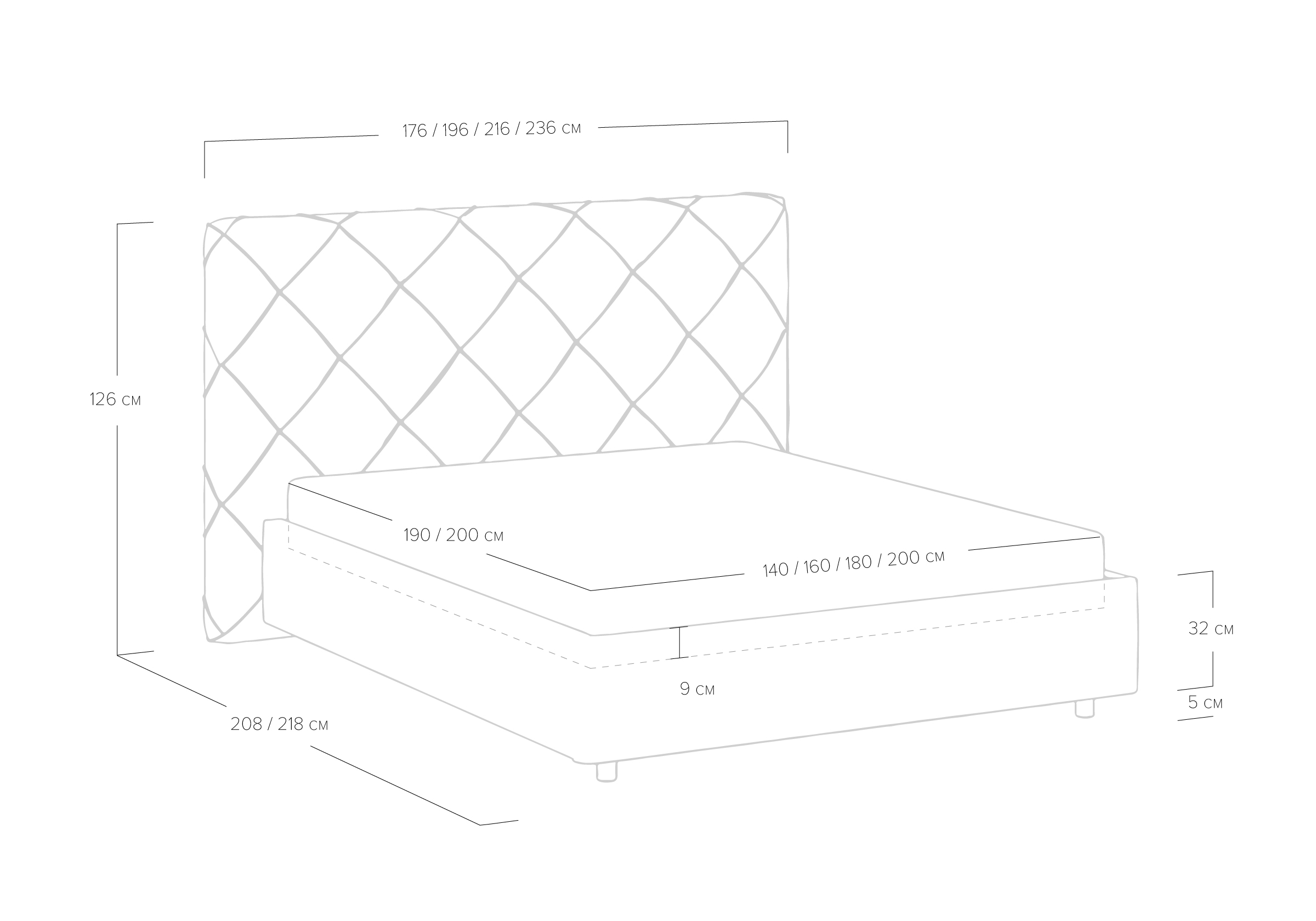 Современная интерьерная кровать. Ножная царга кровати скругленная по углам, что обеспечивает более элегантный внешний вид. При необходимости кровать может быть укомплектована разборным или неразборным металлическим основанием с ламелями, подъемным механизмом с бельевым ящиком, трансформируемым основанием Aquarius.