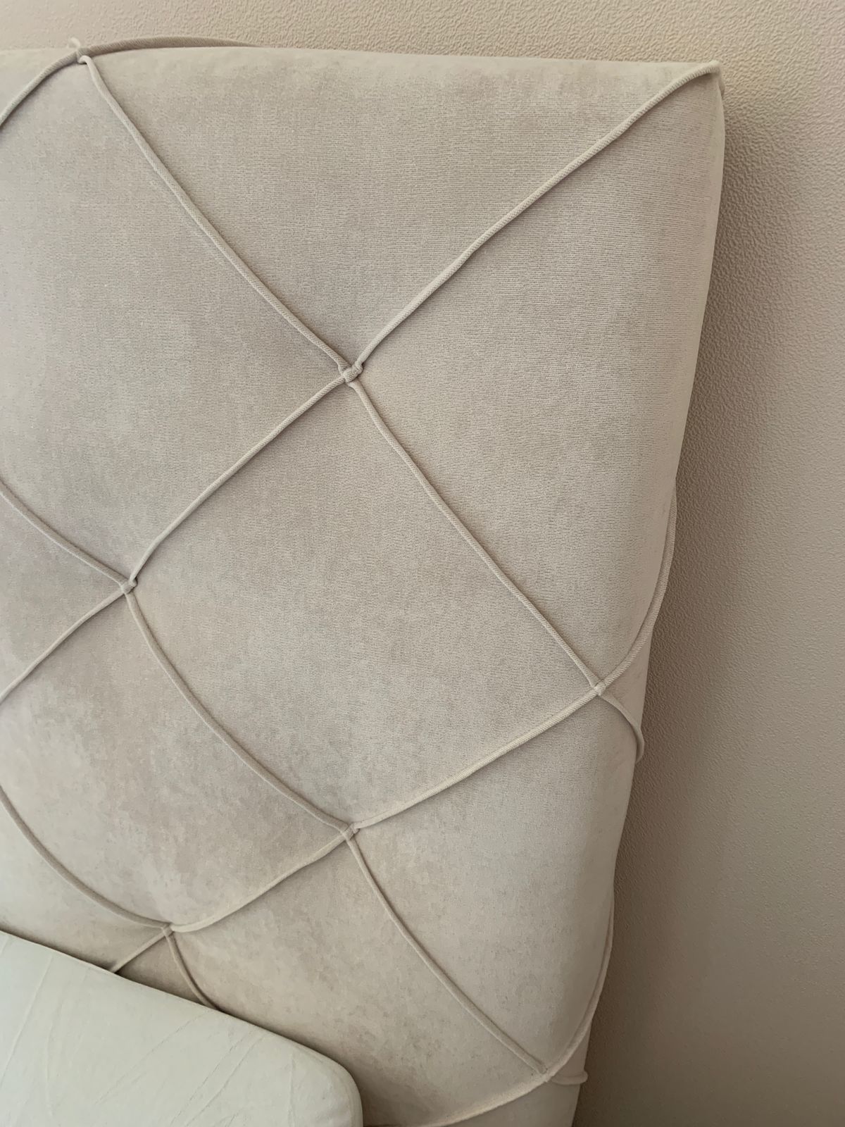 Кровать прочная, подголовник очень эффектно смотрится за счёт вылетов за границы кровати, ткань шинил - отличного качества, смотрится интересно и при дневном и при искусственном освещении.
