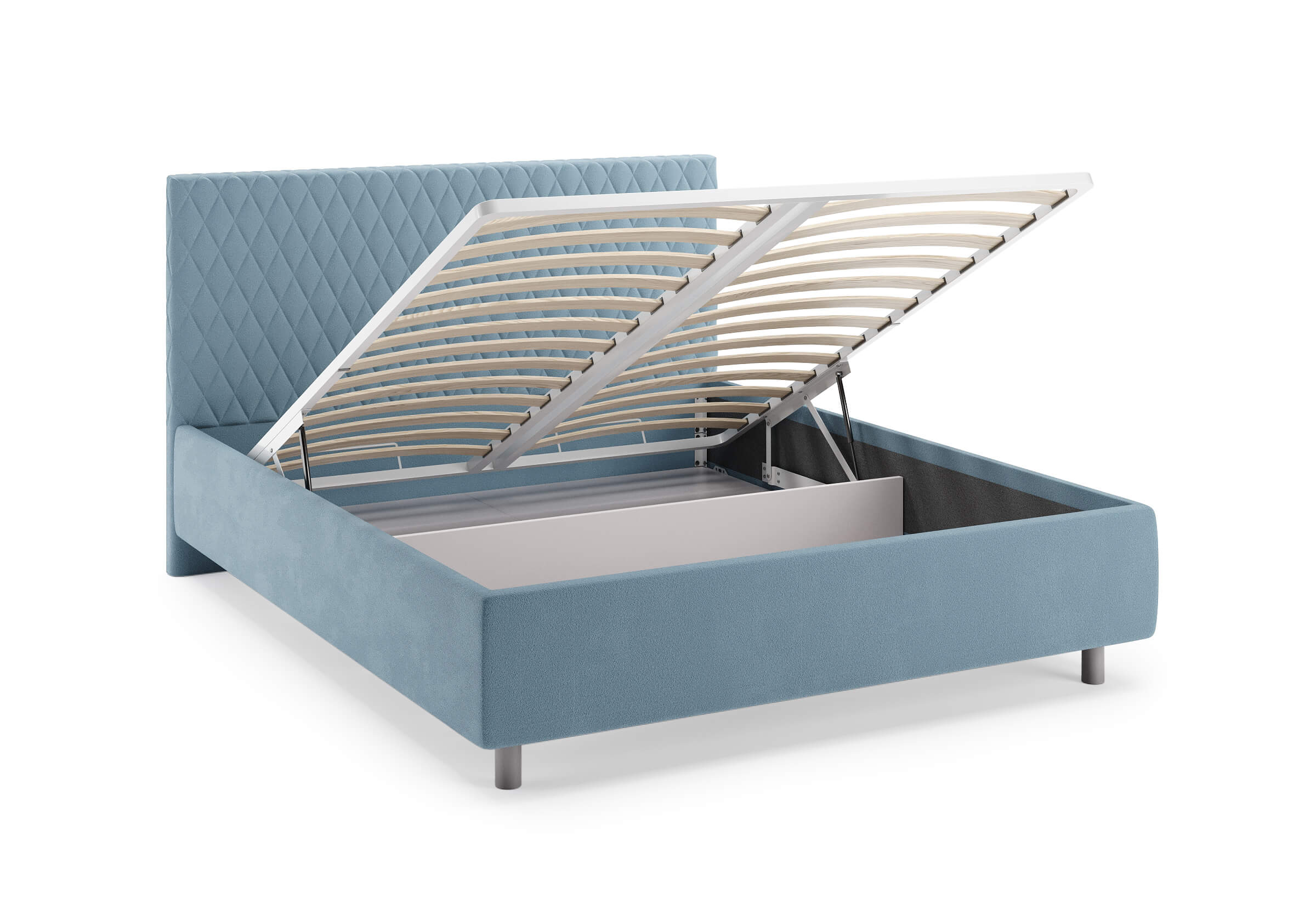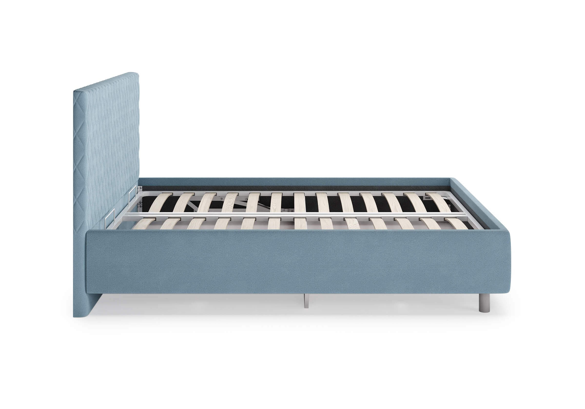 Основание кровати на высоких металлических ножках. Благодаря увеличенной высоте позволяют осуществлять легкую уборку под кроватью, даже с помощью робота-пылесоса.