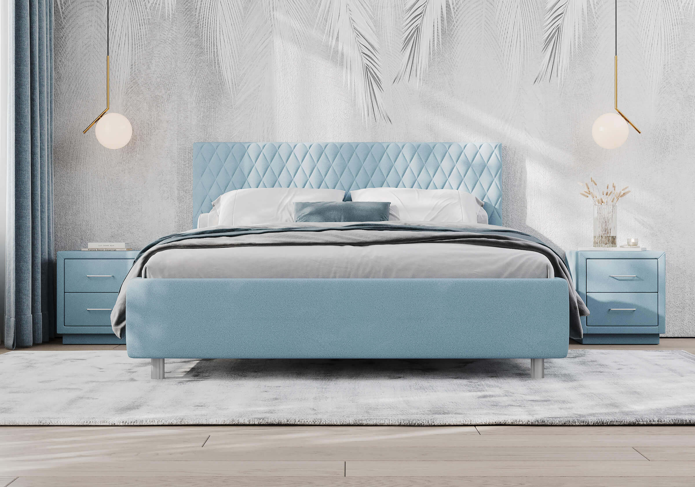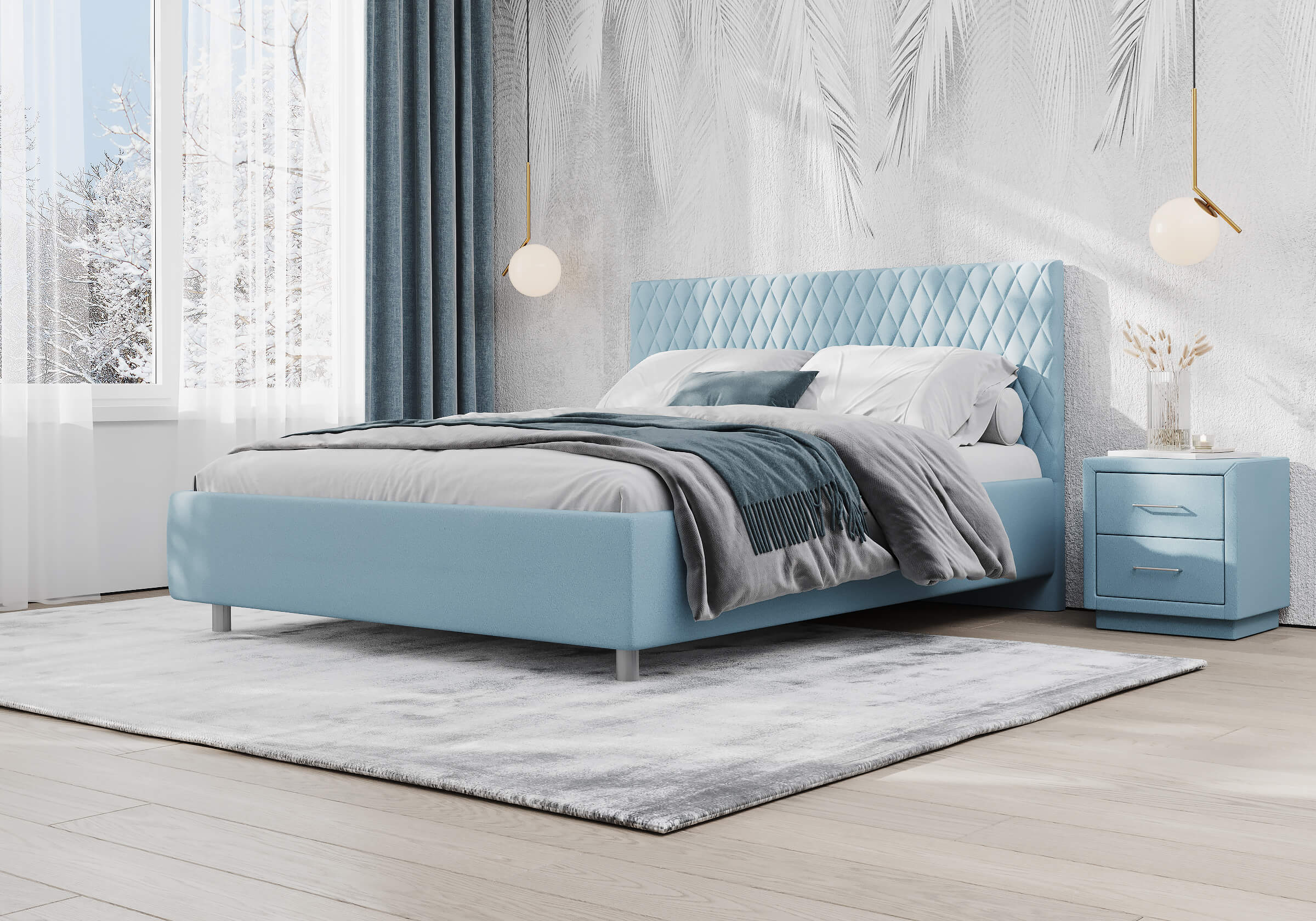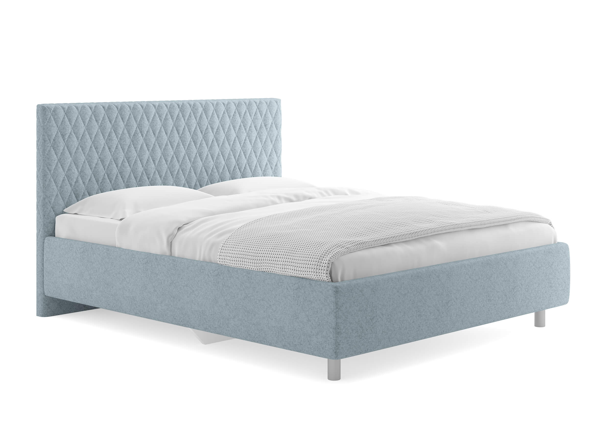Прямую форму изголовья декорирует мягкий чехол. Чехол изголовья простеган ромбами среднего размера, что добавляет модели объем и подчеркивает выразительность. Кровать Stella лаконична, нейтральна, не берет на себя много внимания поэтому органично впишется в большинство современных интерьеров.  Увеличенный просвет от пола позволяет облегчить уборку под кроватью, в том числе роботом–пылесосом. Царги кровати выполняются по технологии съемного чехла. При необходимости кровать может быть укомплектована разборным или неразборным металлическим основанием с ламелями, подъемным механизмом с бельевым ящиком.