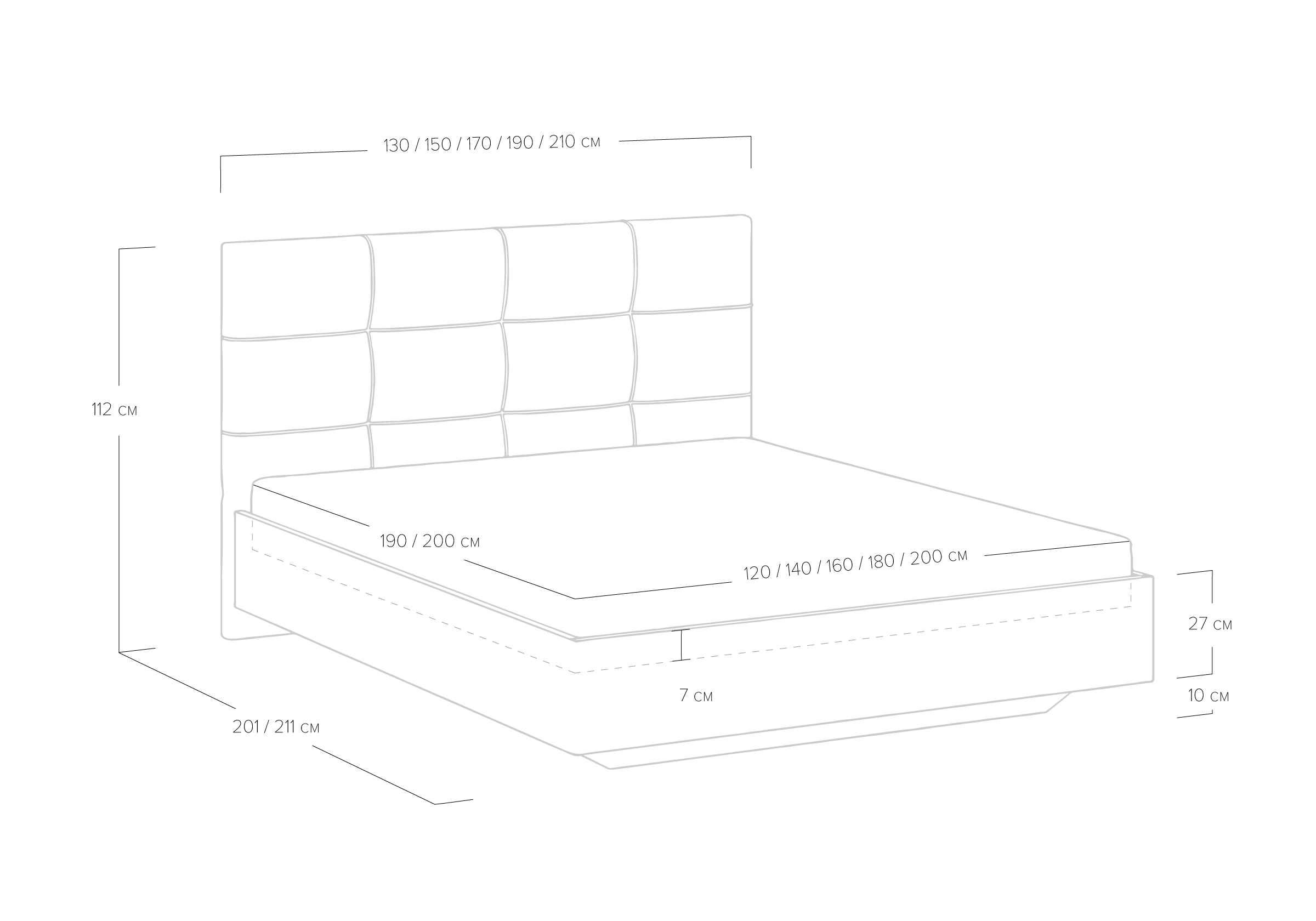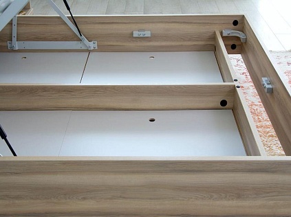Возможность установки подъемного механизма со вместительным бельевым коробом, 13 см глубиной. Дно бельевого ящика легко сдвигается, что позволяет просто убраться под кроватью.