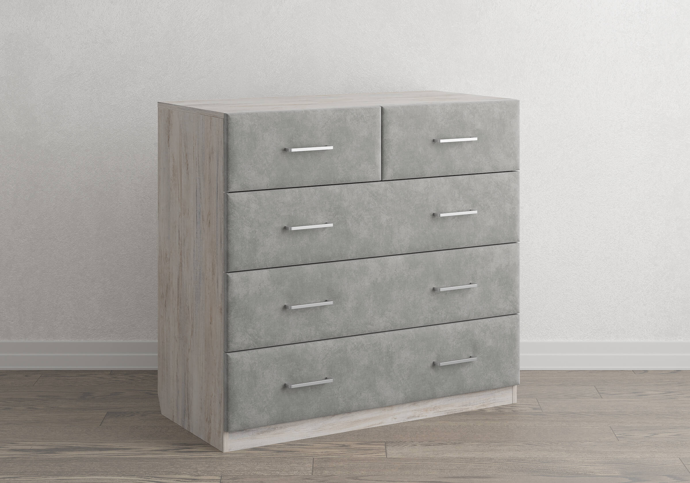 Комбинированный комод Tomas с пятью вместительными ящиками станет элегантным дополнением интерьера. Корпус, выполненный из высококачественной ЛДСП, гарантирует прочность и долговечность, а мягкие фасады в ткани и изящные металлические ручки добавят уют. Комод имеет скос под плинтус, это позволяет устанавливать его вплотную к стене. Благодаря своему дизайну и широкому выбору вариантов исполнения комод можно разместить не только в спальне, но и в прихожей или гостиной.