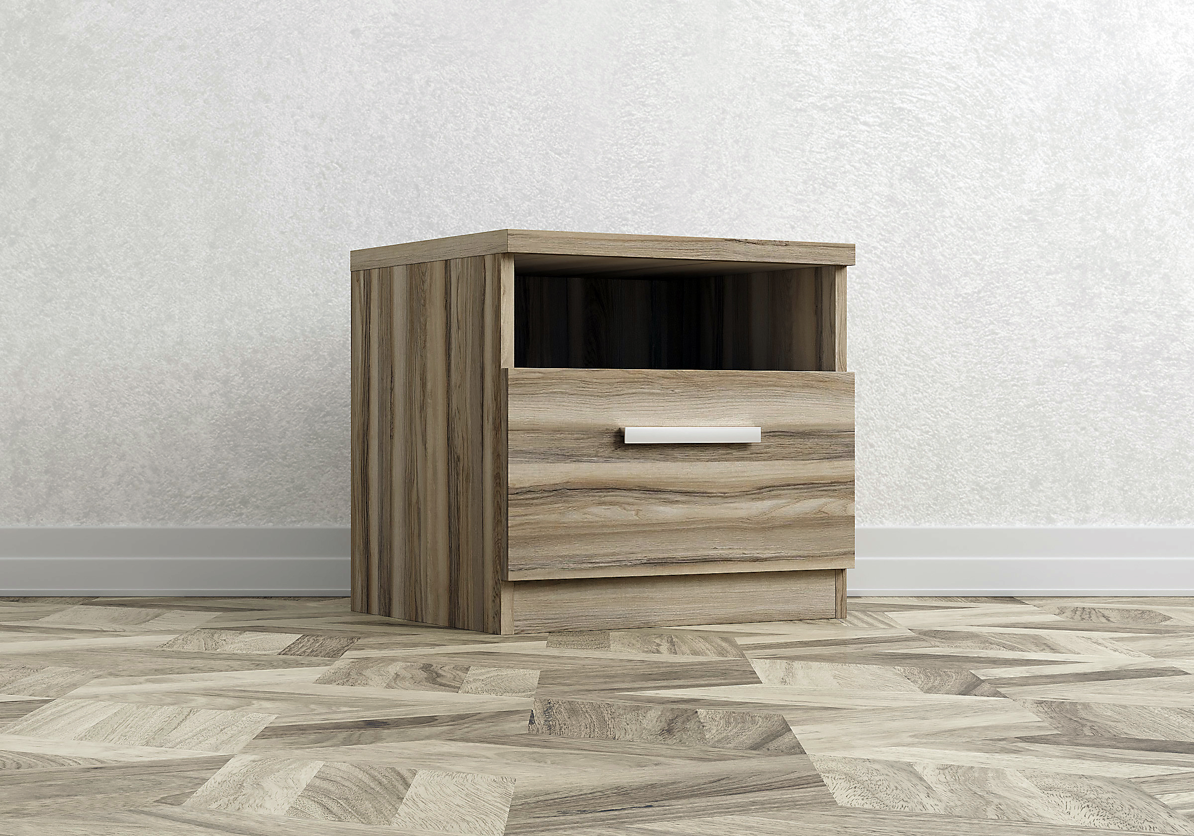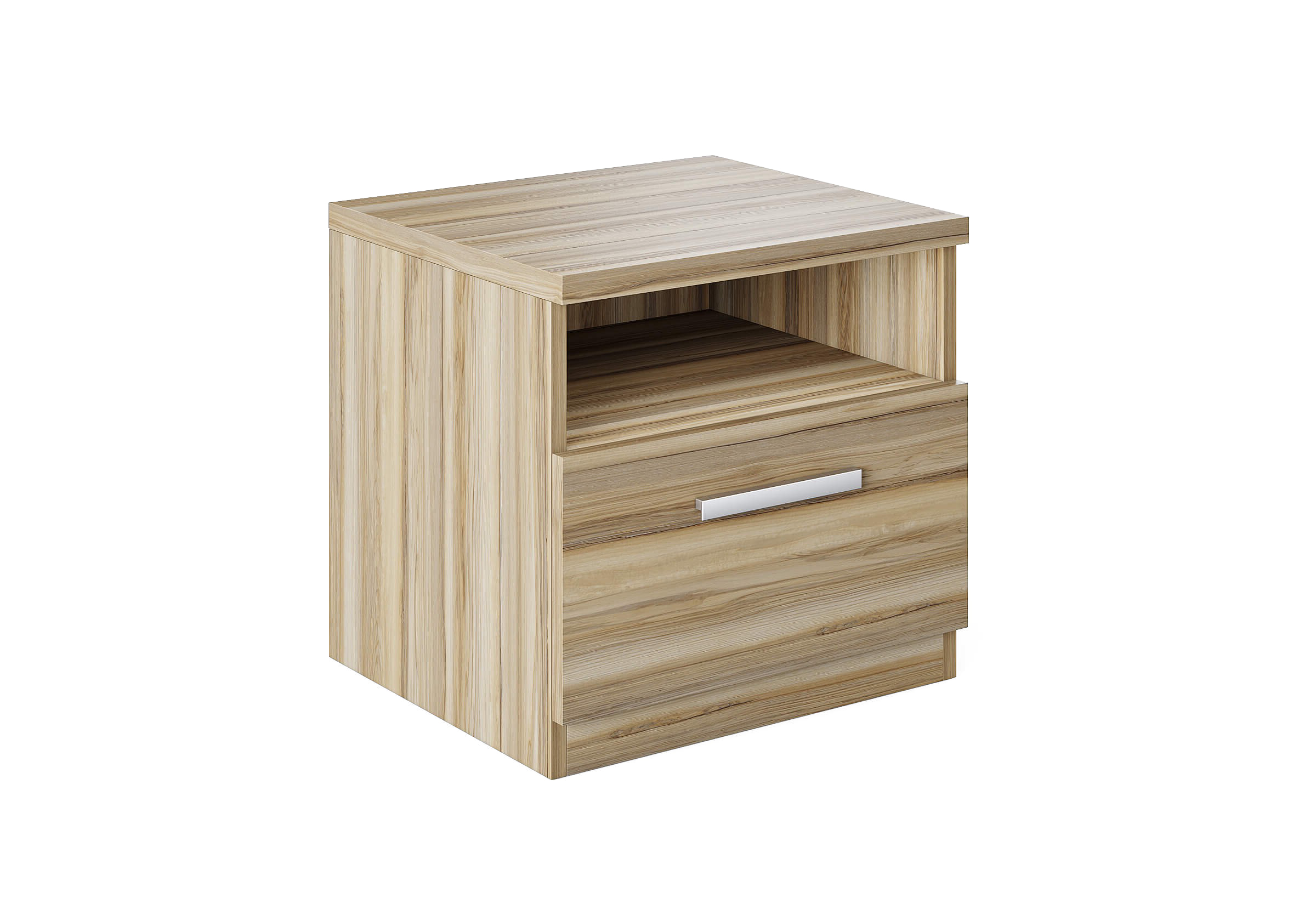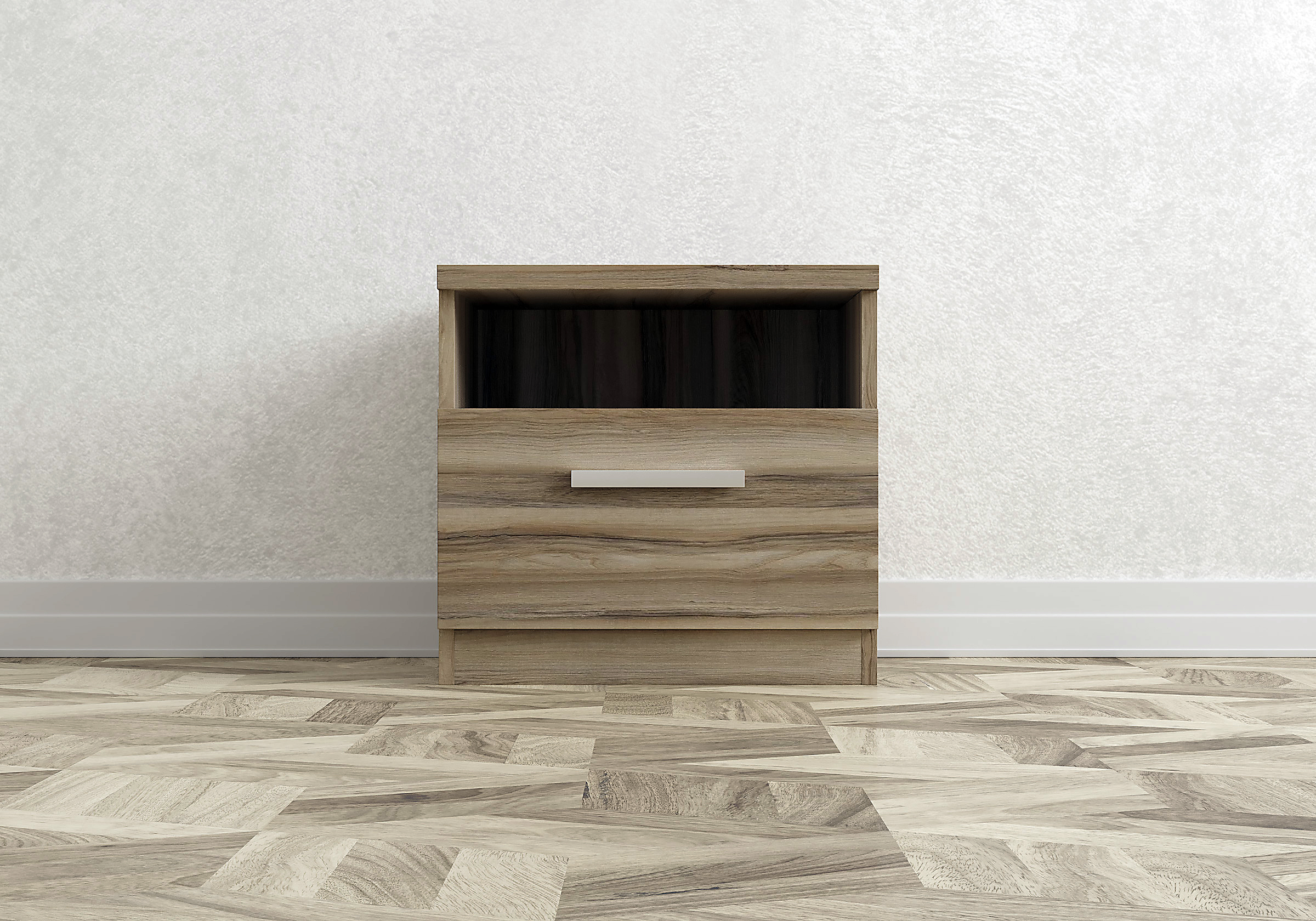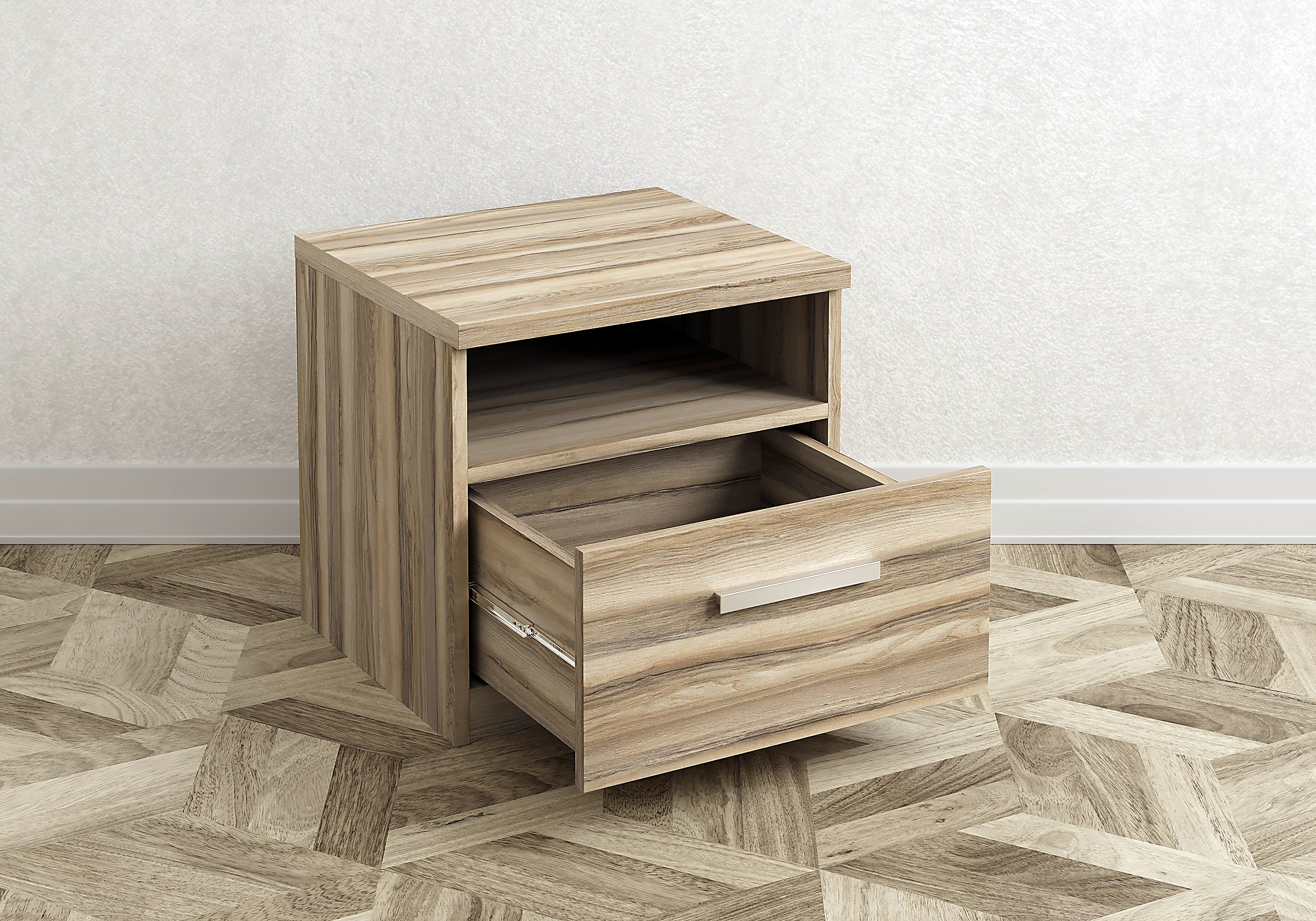 Прикроватная тумба с одним выдвижным ящиком и нишей сочетается с любыми моделями кроватей. Прямые углы, лаконичные  металлические ручки, увеличенная толщина плиты ЛДСП 25 мм. Шариковые направляющие без доводчика. Стильная и практичная тумба прекрасно дополнит собой любой интерьер.