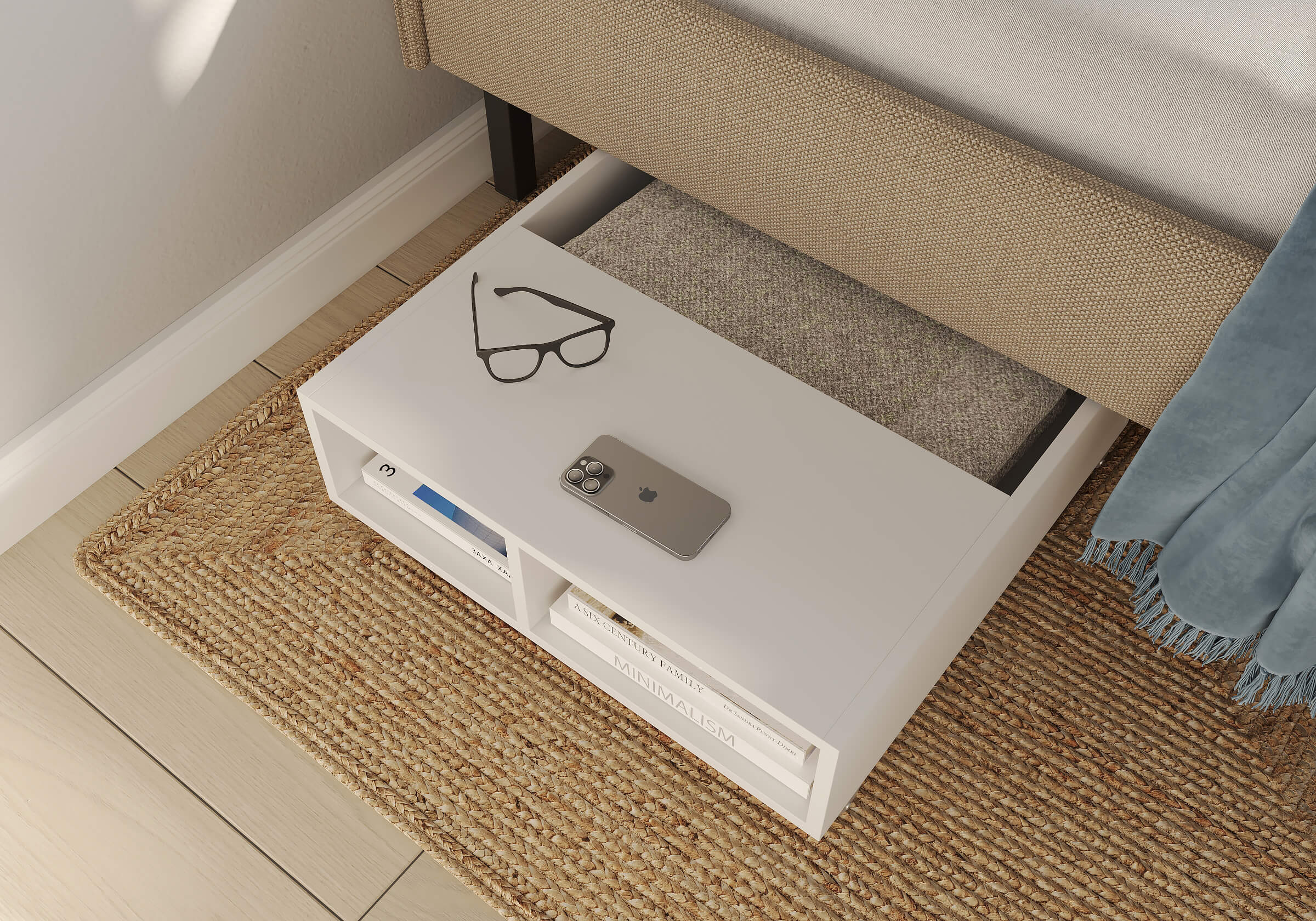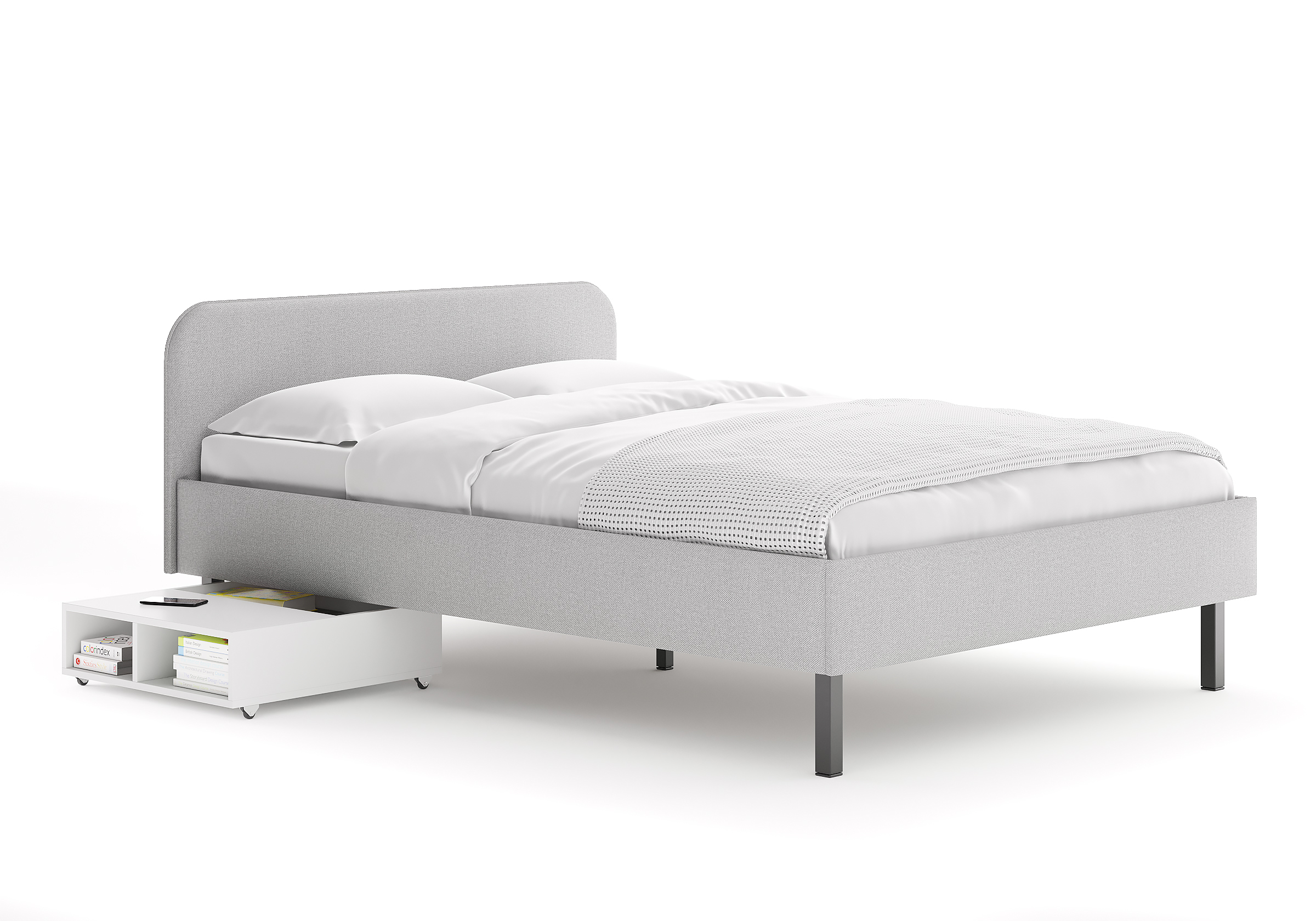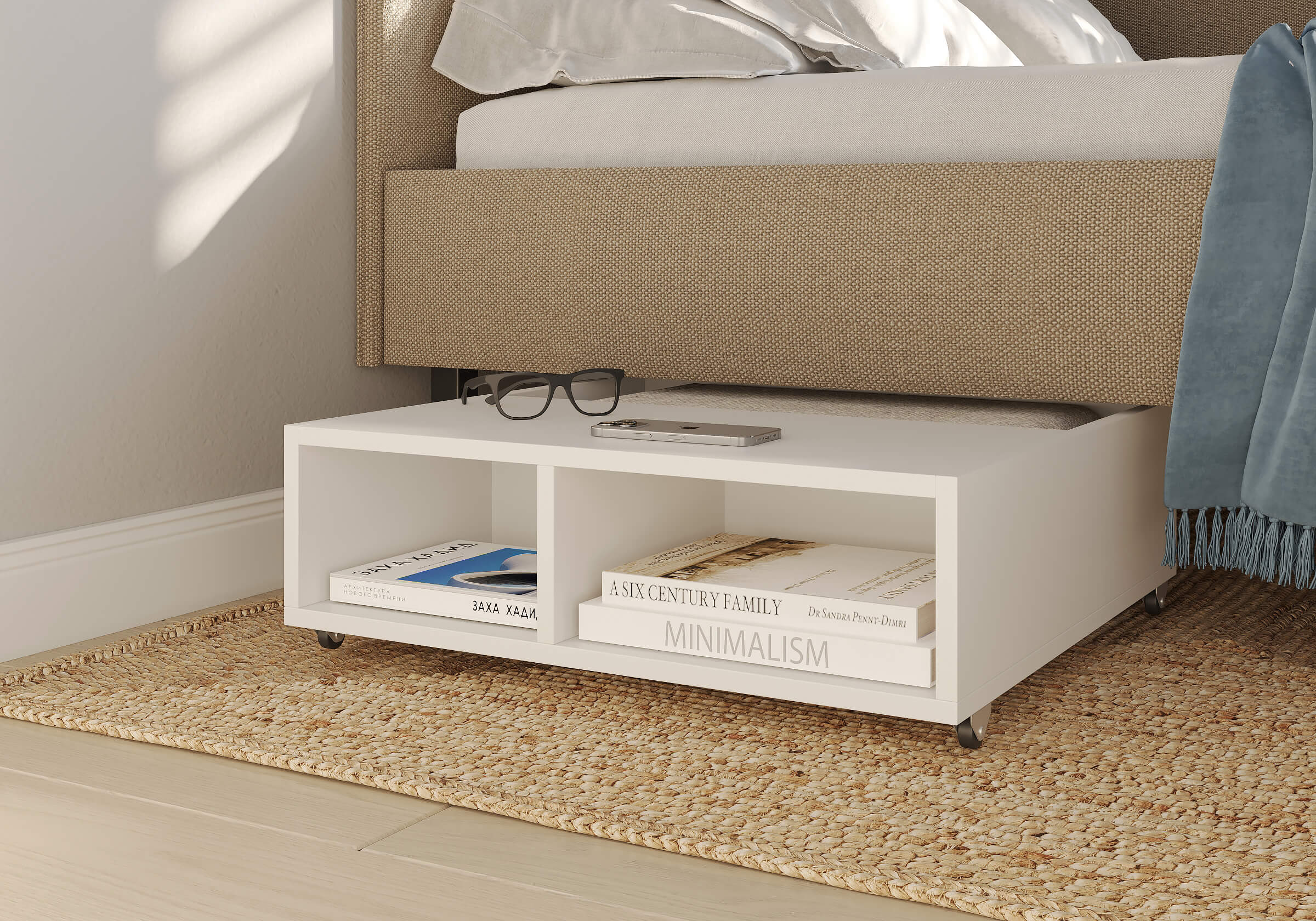 Тумба выкатная - лаконичное и функциональное решение для интерьера в современном стиле и стиле минимализм. Практичная тумба на колесных опорах – это и универсальная прикроватная тумбочка, и дополнительное место для хранения вещей. Идеально сочетается с кроватями Hanna и Julia, является их функциональным дополнением. Тумба подходит для небольших спален и гостиных. Помогает существенно сэкономить место в комнате. Такая тумба позволяет задействовать пространство под кроватью, не загромождает спальню и скрывает от глаз необходимые мелочи. Сочетание открытых и закрытых полок делает тумбу универсальной и современной. Материал исполнения корпуса тумб – ЛДСП, 2 цвета - белый, графит. Надежные колесные опоры позволяют вам легко выдвигать и задвигать тумбу.