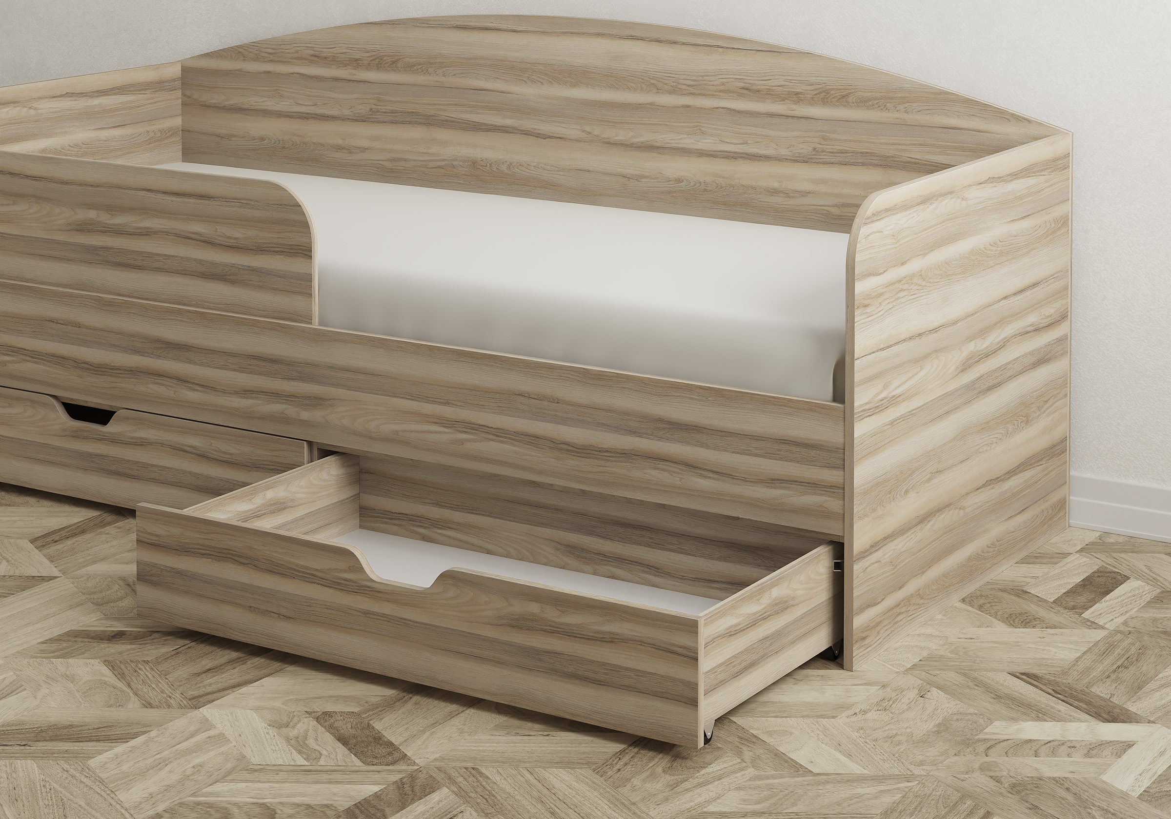 К детской кровати ящик не прилагался, заказали этот, под модель Mariana . В пазы кровати встал идеально. Очень удобная выемка и колесики. А главное, уже год и внешнего вида ни ящик ни кровать не потеряли, хоть дети в комнате своей буквально на ушах стоят. Рекомендую!